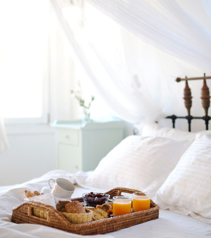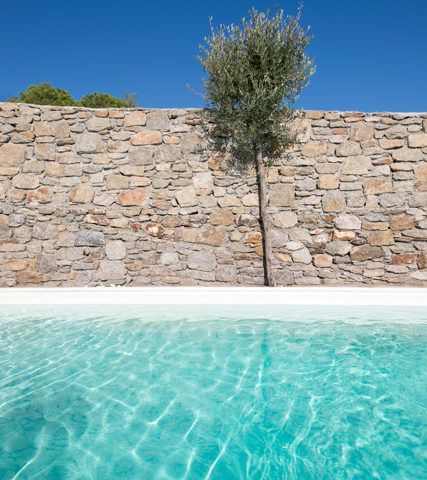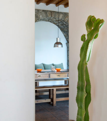 The interior is classic with a modern edge: there is an open floor plan for the kitchen, sitting and dining area and the antique wooden furniture is matched with white upholstery and cotton floor-tiles.