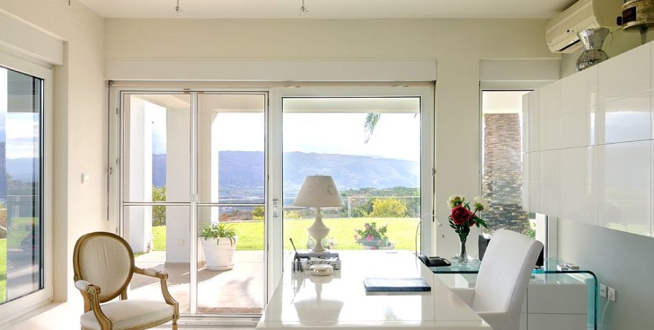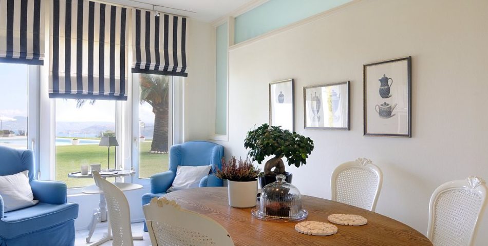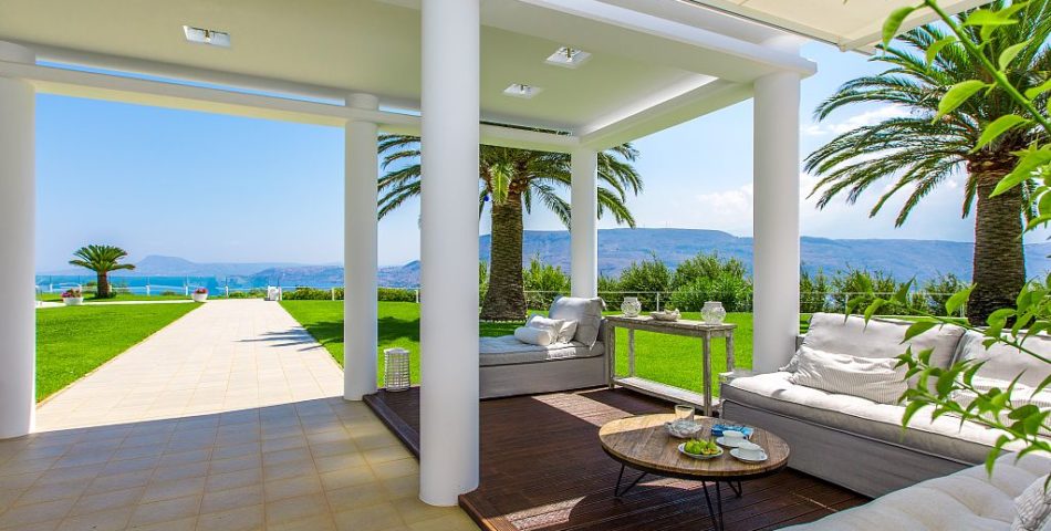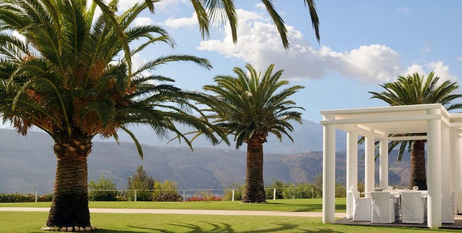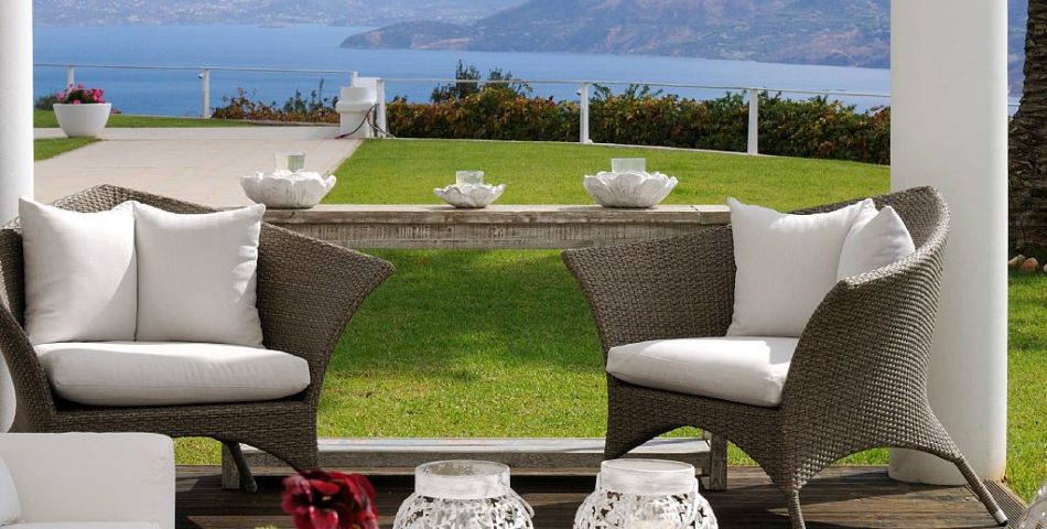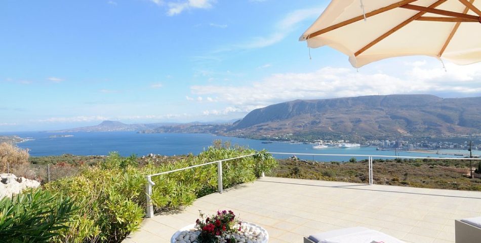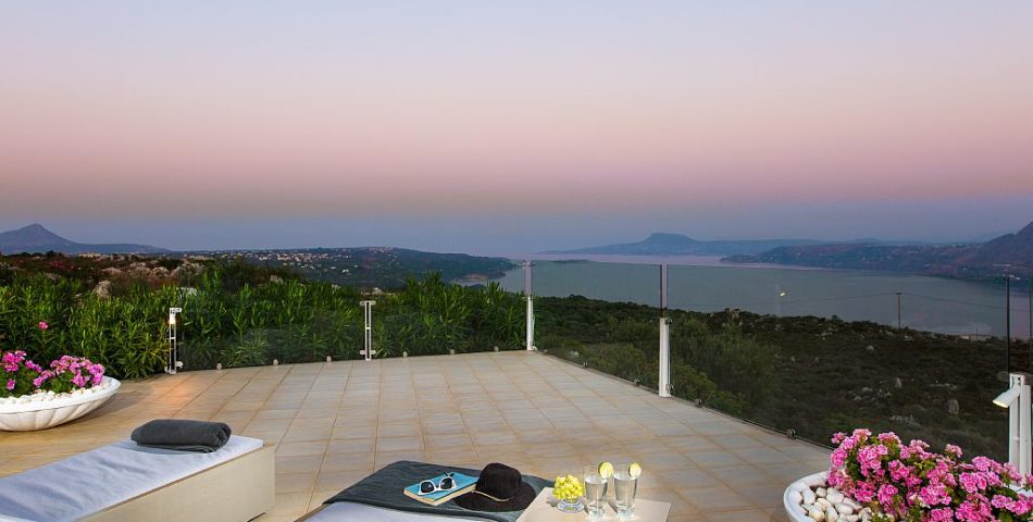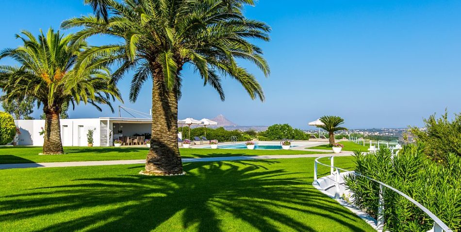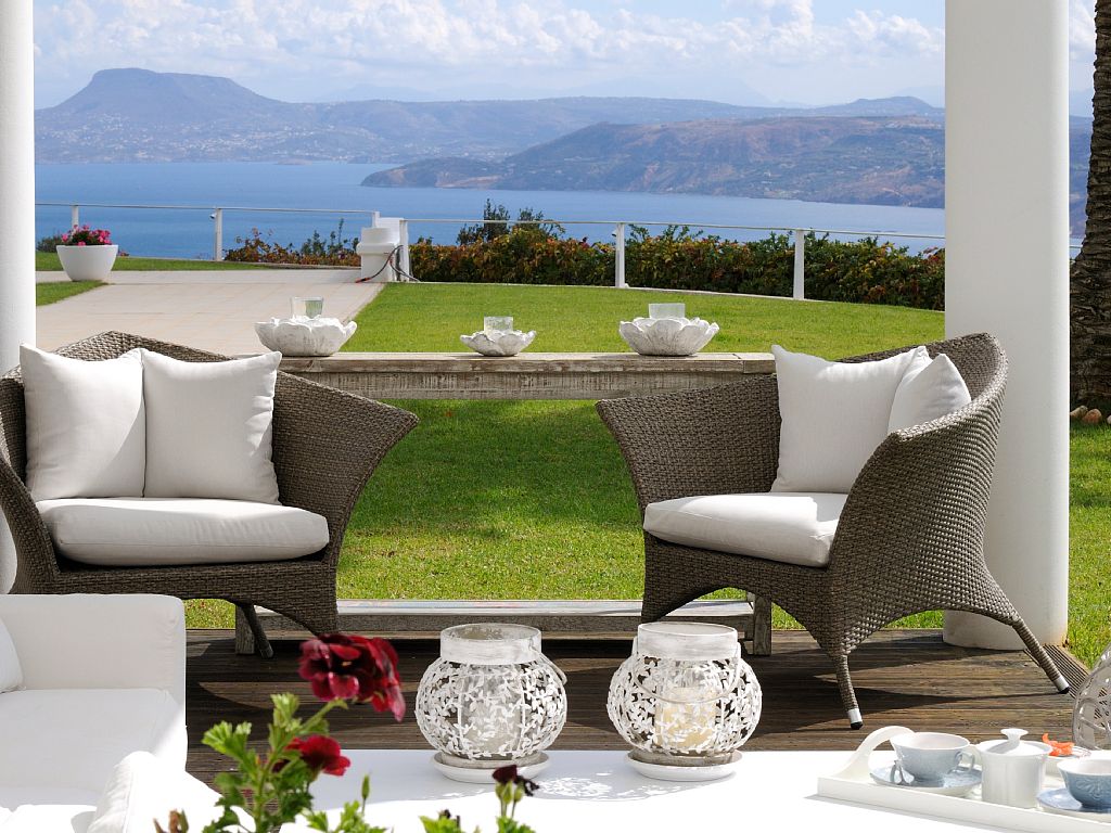 The villa has a panoramic view of the Souda Bay and the White Mountains, offering a striking combination of contradictory sceneries, the Aegean blue and the wild mountainous landscape of Crete all in one enchanting picture that may well please all kinds of tastes. At sunset, you will be charmed by the magnificent colours deluging the sky and later on by the glowing moon illuminating the sea below. The exterior is dominated by rich lawn gardens where tall palm trees, cypresses, oleanders, olive trees and other local fruit trees, plants and herbs coexist to compose colourful surroundings filled with alluring essences.
