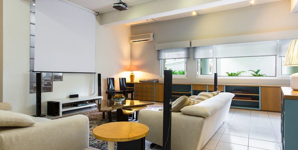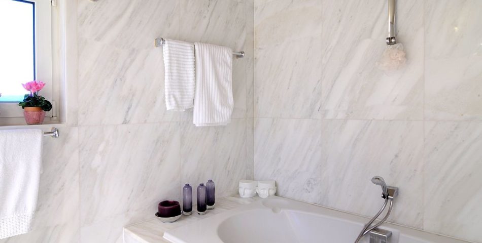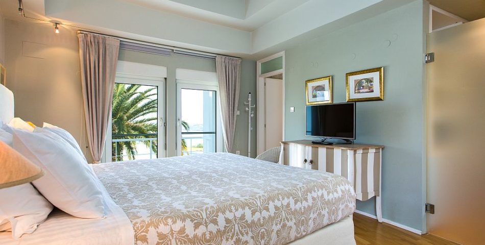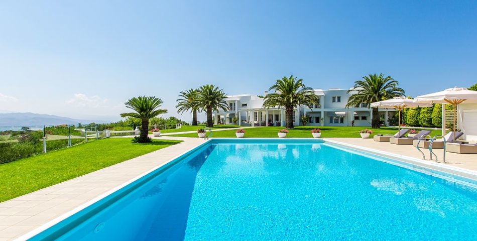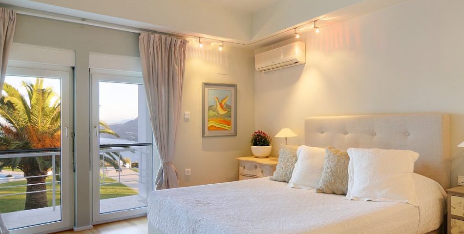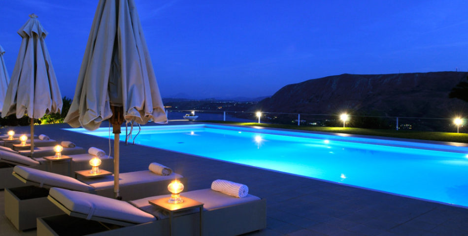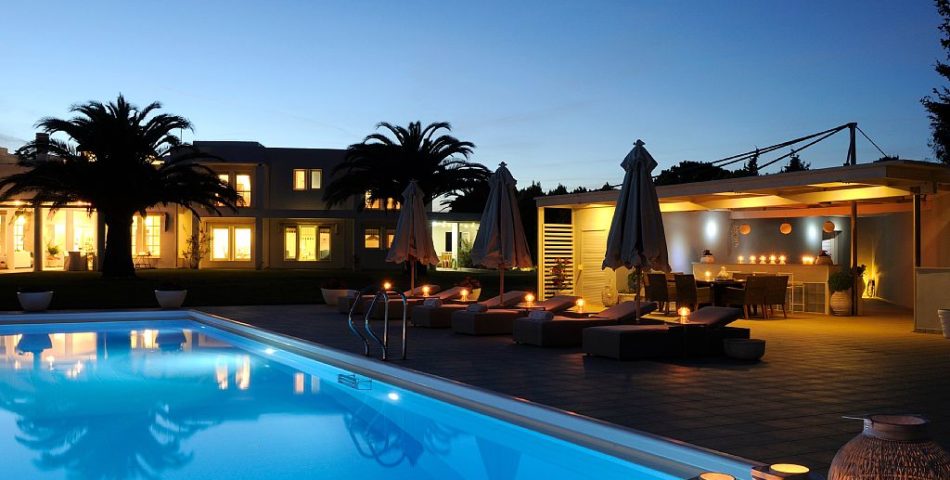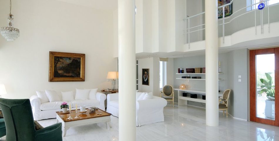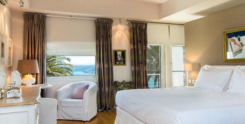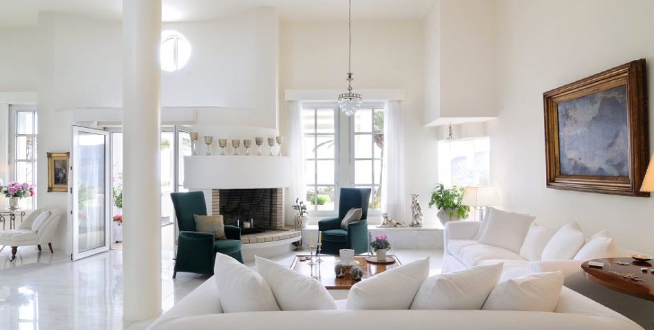 The interior décor style as it reflects the personality of the mansion’s owner is eclectic. White marble of “Penteli” is the dominant material harmoniously matched with furniture and decorative elements of a colonial and vintage design. Each one of the 5 plethoric rooms of the ground floor, living room, two dining rooms, office room and the fully equipped kitchen, has its own door to the exterior, leading within a few steps to the garden. From the living room there is a staircase leading to the first floor; interior balcony overlooking the living room leading to 3 main bedrooms. Each bedroom (2 double, 1 twin) has en-suite bathroom (tubs), and exterior balcony with views to the garden, the pool and the Souda bay. Another staircase leads to the lower ground floor where Gym equipment and a large playroom area with fireplace, home cinema with video games can be found. Furthermore, two bedrooms (1 double, 1 twin) with en-suite bathroom (shower) each are located in the lower level ground floor.
