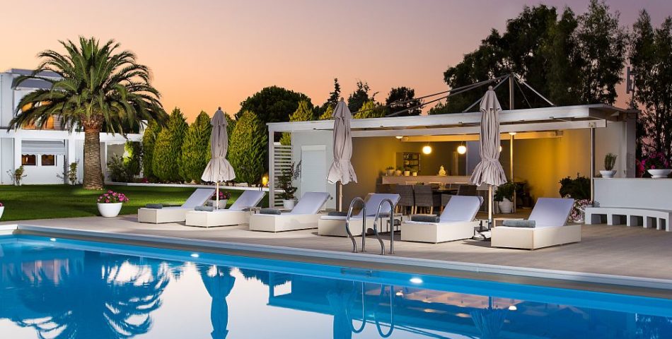The large swimming pool and the sun terrace around it, shaded with a pergola and large umbrellas, makes “staying at home” an equally satisfying choice when you don’t feel like driving to the beach. Large sofas, sun-beds, coffee tables and a large dining table make this sitting area an all-day relaxing choice next to the pool.